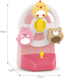 Zavrtite vesel svet barv in melodij! Ta kompaktni vrtiljak/ruleta z ljubkimi živalicami se po pritisku ročice zavrti in otroke spremlja s prijetnimi toni pozitivke. S stabilnim priseskom ga preprosto pritrdite na ravno površino – na primer na mizo ali pladenj jedilnega stolčka – in otrok se lahko varno igra. Zadnja stran z številčnico na zabaven način spominja na star telefon in razvija domišljijo.