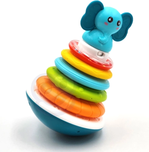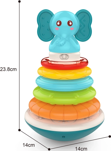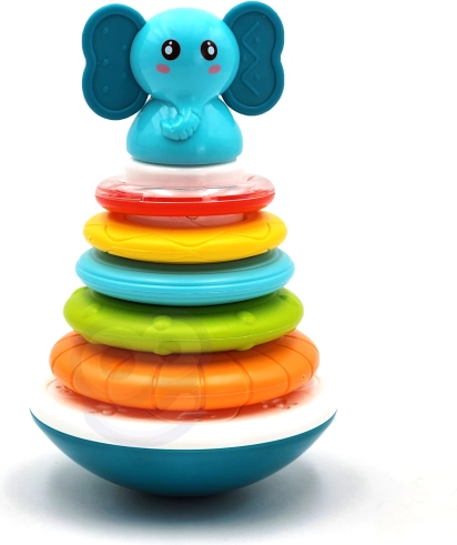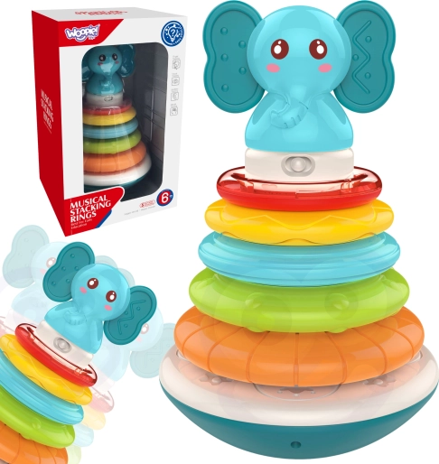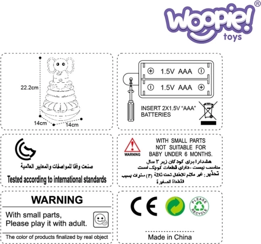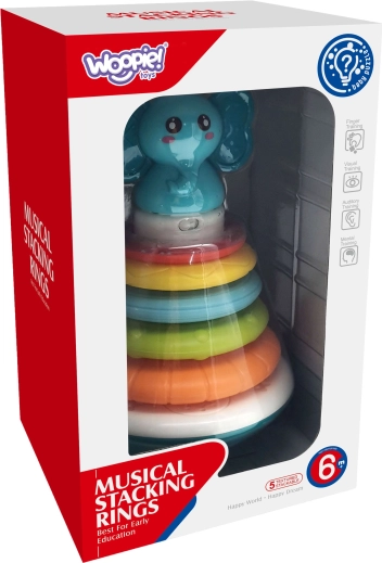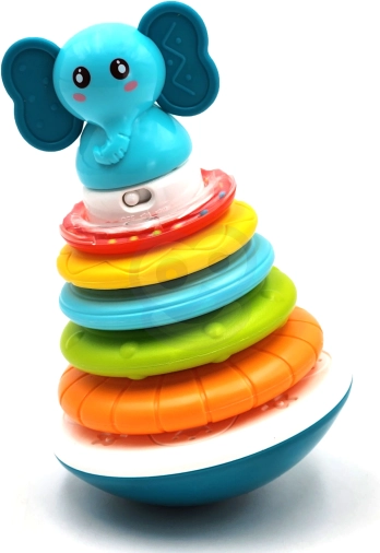 Interaktivni stolp Slonček Woopie je postavljen na stabilno osnovo, ki se ob dotiku ziblje kot klasična "vstani padni" igrača, vendar jo je težko prevrniti. Igrača ob dotiku sprošča zvoke ropotulje ter oddaja lučke in vesele melodije. Del igre je zlaganje obročkov od največjega do najmanjšega, pri čemer se aktivirajo zabavni zvoki. S pritiskom na slončka se zaženejo različne melodije in zvoki, ki otroke spodbujajo k igranju.