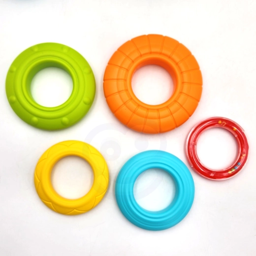 Obročki različnih barv in premerov, skupaj z ropotuljico in melodičnimi zvoki, spodbujajo senzorični in motorični razvoj otrok.