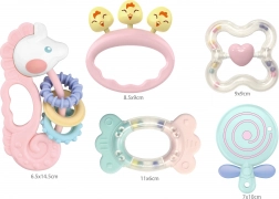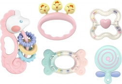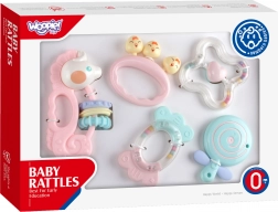 Komplet WOOPIE Baby ponuja premišljeno kombinacijo grizal in ropotuljic, ki lajšajo občutljive dlesni ter hkrati spodbujajo otrokove čute. Različne oblike in površine vzbujajo naravno radovednost, podpirajo koordinacijo roka–oko in fino motoriko. Žive barve in nežni zvoki ropotuljic pomagajo razvijati pozornost in zaznavanje.