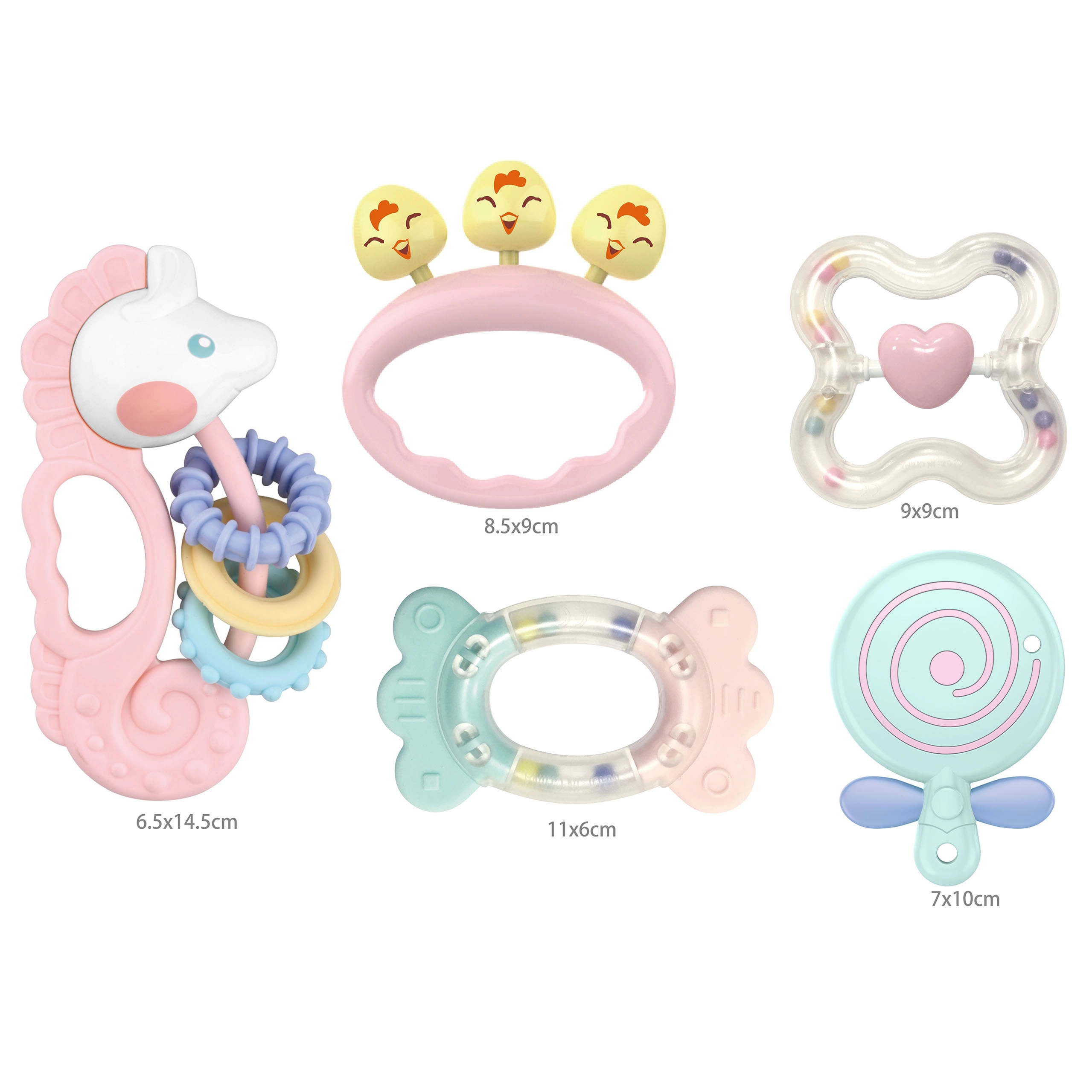 - 5 različnih grizal–ropotuljic za raznoliko stimulacijo
