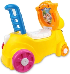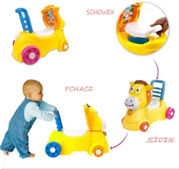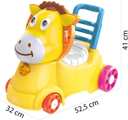 Prisrčen rumen osliček motivira otroke k gibanju, izboljšuje ravnotežje in koordinacijo ter spodbuja samostojnost. Zaradi praktičnega ročaja in stabilnega naslonjala je primeren tako za prve korake kot za varno odrivanje in vožnjo po stanovanju.