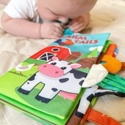 Zaradi trpežnega tekstila je knjižica vodoodporna in preprosta za vzdrževanje. Praktičen prijem omogoča uporabo kot obešeno igračo na vozičku ali posteljici, zato bo vedno pri roki doma in na poti. Varna od rojstva, odlična kot prva izobraževalna igrača.