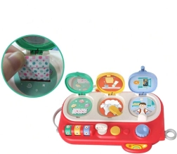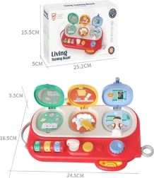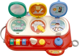 Ta pametna izobraževalna igrača ima tri okenca, od katerih se vsako odpre na drugačen način – na kombinacijo simbolov, s ključkom ali z gumbom in vrtljivim upravljalnikom. V notranjosti otroci najdejo različna presenečenja: izvlečne »robčke«, sličico zobka s premično ščetko in figurico z vrtljivim izborom oblačil. Vsako dejanje ima jasen rezultat, kar krepi razumevanje vzroka in posledice.