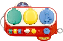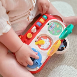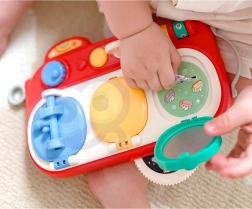 Gumbi, stikala in vrtljivi elementi razvijajo fino motoriko ter koordinacijo oko–roka, hkrati pa ohranjajo pozornost zaradi kontrastnih barv.