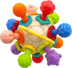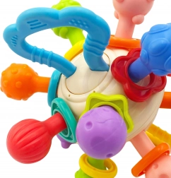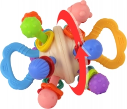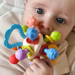 Kombinira lastnosti grizala in ropotuljice ter otrokom ponuja različne načine zabave.