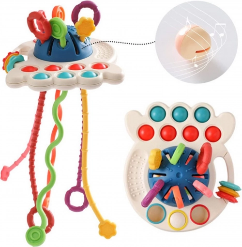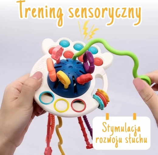Odkrijte večnamensko senzorično igračo in grizalo, navdihnjeno z metodo Montessori, ki podpira razvoj čutov, fino motoriko in prinaša olajšanje pri izraščanju zobkov. Barvne vlečne vrvice z različnimi teksturami, vrtljivi elementi in popp mehurčki spodbujajo prijemanje, vlečenje in raziskovanje, medtem ko varni materiali in preprosto vzdrževanje razveseljujejo starše.