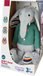 Interaktivni plišasti slon Woopie je opremljen s tremi senzoričnimi območji na nogah in trebuščku, ki ob dotiku predvajajo glasbo. Njegovi rožnati lici svetita, kar ustvarja čarobno atmosfero okoli igrače. Plišastek je oblečen v pulover, pod katerim je prostor za 3 baterije. Ta mehak, na dotik prijeten slonček bo postal otrokov prijatelj za mnogo let.
