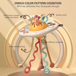 Ta otroška montessori igrača WOOPIE BABY v obliki UFO ponuja bogate senzorične dražljaje zahvaljujoč šestim vrvicam z različnimi teksturami in barvami, trem mehkim gumbom in enemu čvrstejšemu drsnemu gumbu. Vlečenje za vrvice povzroča različne zvoke in nežne vibracije, ki spodbujajo radovednost in zbranost. Mehki robovi in strukturirane površine nudijo olajšanje občutljivim dlesnim pri zobenju.