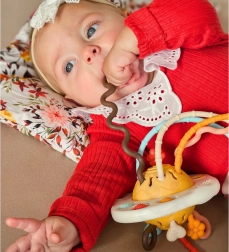 Izdelano iz 100 % varnega silikona brez BPA. Mehki robovi in različne teksture nežno masirajo dlesni ter lajšajo izraščanje zob.