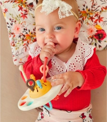 Trije mehki gumbi in en nekoliko trši drsni gumb spodbujajo pritiskanje in drsenje, krepijo prstke in fino motoriko.