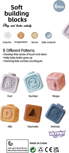 Kocke so idealne kot grizalo – lajšajo dlesni in hkrati spodbujajo raziskovanje. Ob stisku oddajo zvok, ki uči načel vzroka in posledice. Komplet je primeren za tla, posteljico in tudi za kad. Otroci iz njih zgradijo stolp, jih razvrščajo po številkah ali reliefih ter vadijo ustvarjalnost.