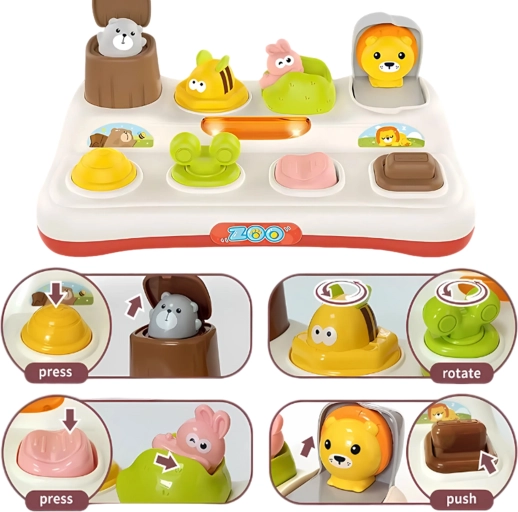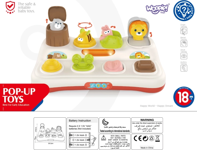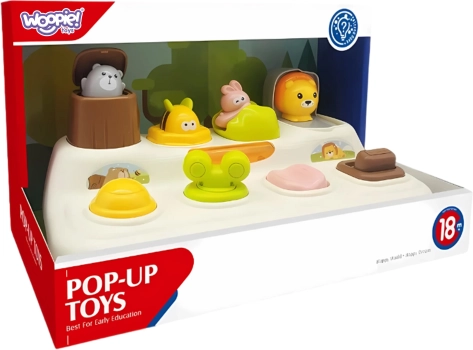Interaktivna pop-up igrača WOOPIE prinaša otrokom od 18 mesecev naprej zabavno obliko učenja. Različni upravljalni elementi – stikalo, vrtljivo kolešček in tipke – sprožijo mehanizem, zaradi katerega živali poskočijo. Tako otroci vadijo koordinacijo roka–oko, razvijajo čutno zaznavanje in se učijo, kako njihovo dejanje povzroči reakcijo.