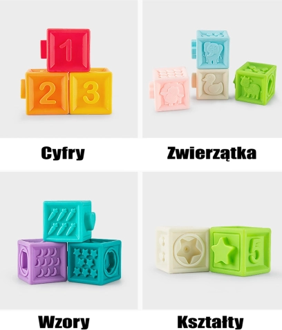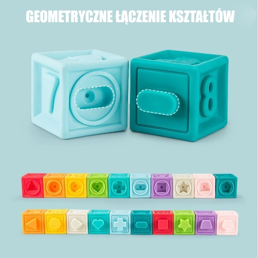 Set vsebuje 20 kock v nežno ujemajočih se barvah, ki jih je mogoče zlahka zlagati in medsebojno povezovati. Spodbuja vidno-slušno koordinacijo, razvoj motorike, vizualno zaznavanje in logično razmišljanje. Številčni in matematični simboli naravno vodijo k učenju računanja in preprostim nalogam.
