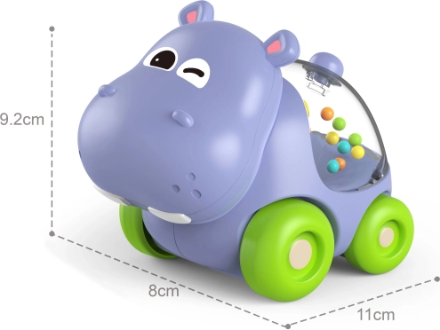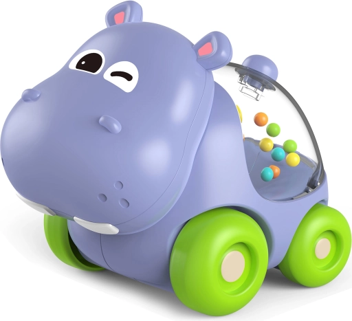 Woopie Avto Ropotuljica v obliki simpatičnega povodnega konja! Ta edinstvena igrača spodbuja otrokovo aktivnost in hkrati razvija njegove čute. Ob premikanju ropotuljice se v trebuščku povodnega konja začnejo barvne kroglice šelesteti in vrteti ter zagotavljajo zvočne in vizualne dražljaje.