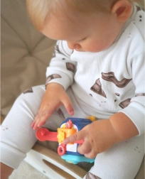 - Spodbuja razvoj motoričnih spretnosti z oprijemanjem, vlečenjem, vrtenjem in pritiskanjem različnih delov