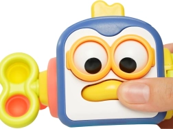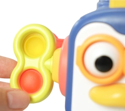 Okrogloličen pingvinček vsebuje gibljive elemente – ob pritisku na nos igračo zavibrira in oči se začnejo premikati.