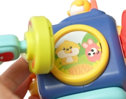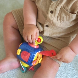 Kocka ponuja različne teksture, vzorce in barvite elemente, ki zagotavljajo spodbudne senzorične izkušnje ter pomagajo razvijati vid, sluh in motoriko otroka. Interaktivni elementi, kot sta poskakujoči kužek ali zvončki, prinašajo zvočno stimulacijo. Igrača na zabaven in celovit način podpira razvoj otroka, zato je odlična izbira.