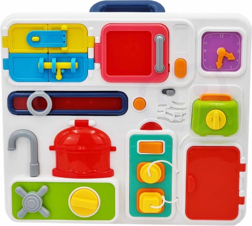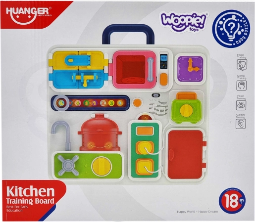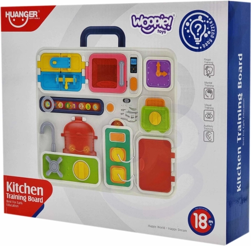 Odkrijte zabavno in izobraževalno igračo za najmlajše: kuhinjsko manipulativno tablo WOOPIE BABY, ki razvija fino motoriko, čutno zaznavanje in koordinacijo. Zahvaljujoč svetlobnim in zvočnim učinkom, delujočim gumbom, stikalom in vrtljivim regulatorjem si otroci varno preizkusijo svet odraslih – od “priključitve” vtiča, preko nastavitve štedilnika do igre z uro.