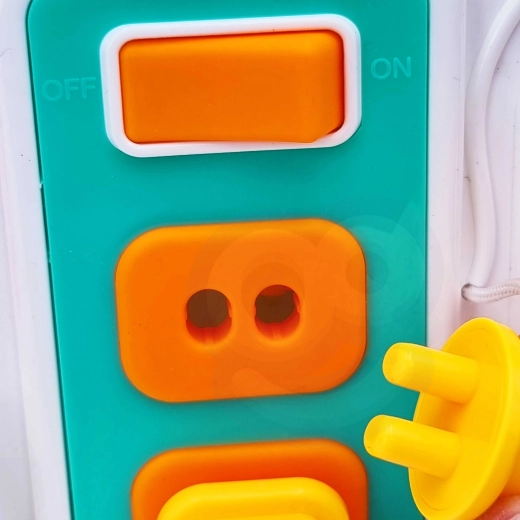 Vrtljivi gumbi, stikala in simulirane vtičnice učijo vzročno-posledične povezave in razvijajo fino motoriko brez tveganja.