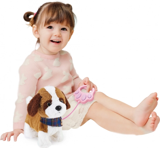 Ta interaktivni plišasti kuža otrokom prinaša veliko zabave s kombinacijo gibanja in zvočnih učinkov. Po priklopu kabla z upravljalnikom v odprtino na vratu se odziva na različne dražljaje: ob pritisku na povodec se začne premikati, z dotikom glave zažene učinke, po plosku pa se znova poda na sprehod. Mehka izdelava ga naredi za idealno igračo za vsakodnevno igro.