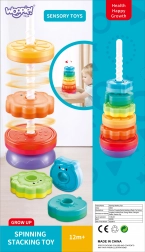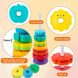 - Komplet vsebuje šest obročev različnih oblik, ki jih je mogoče zložiti drug na drugega in ustvariti barvito, vrtečo se piramido