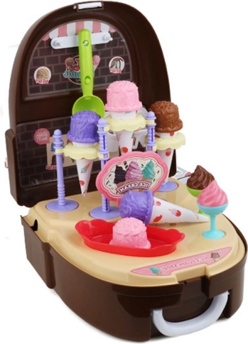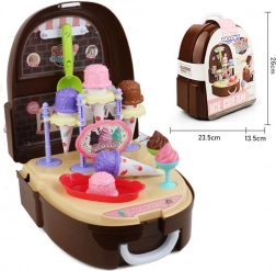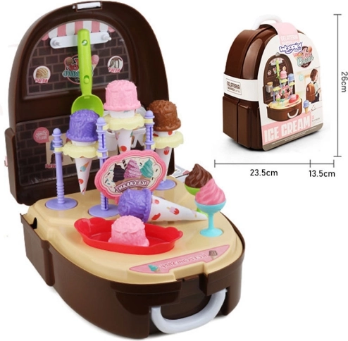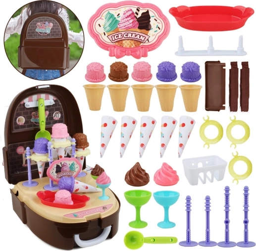 Mali slaščičar vedno pripravljen! Ta ljubek set v obliki nahrbtnika se po odprtju spremeni v popolno sladoledarno in mini trgovinico. Otroci lahko strežejo kepice sladoleda, polnijo kornete in prodajajo sladke dobrote prijateljem in staršem. Zaradi lahke konstrukcije ga zlahka odnesejo na igrišče, k babici ali na počitnice.