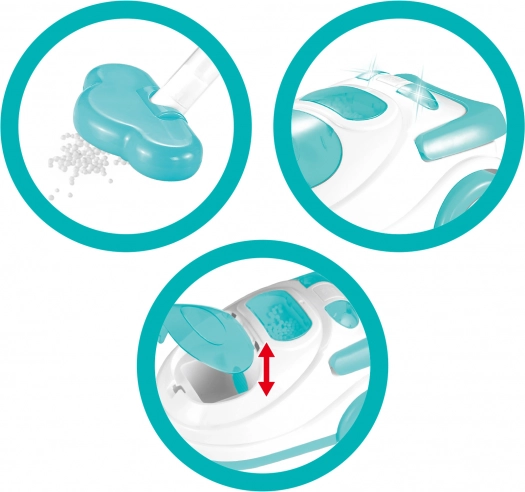 - Kroglice se hranijo v rezervoarju, ki ga je enostavno odpreti in izprazniti.