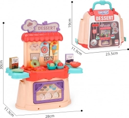 Ta barvit set otrokom prinaša svet slaščic – od krofov in kolačkov do sladoleda – hkrati pa praktično zasnovo, ki se v hipu spremeni iz kompaktnega kovčka v popolnoma funkcionalen pult. Zahvaljujoč naramnemu paščku ga otroci zlahka prenašajo in lahko odprejo svojo mini slaščičarno kjerkoli.