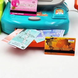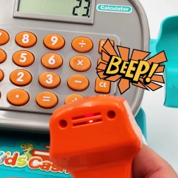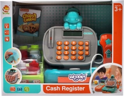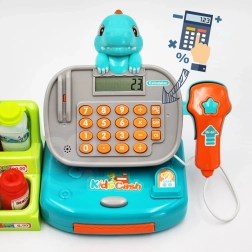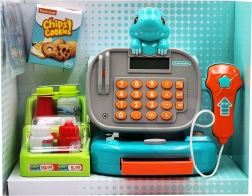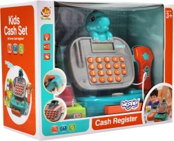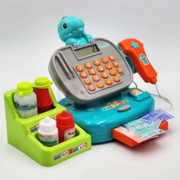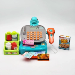 Ustvarite domačo trgovinico z otroško blagajno WOOPIE DINO v modri barvi. Otroci lahko »skenirajo« izdelke s skenerjem z realističnimi zvoki, vnesejo ceno na pravem kalkulatorju in plačajo z kovanci, bankovci ali kartico. Del kompleta je tudi praktična polica za izdelke, ki igri doda pristnost.