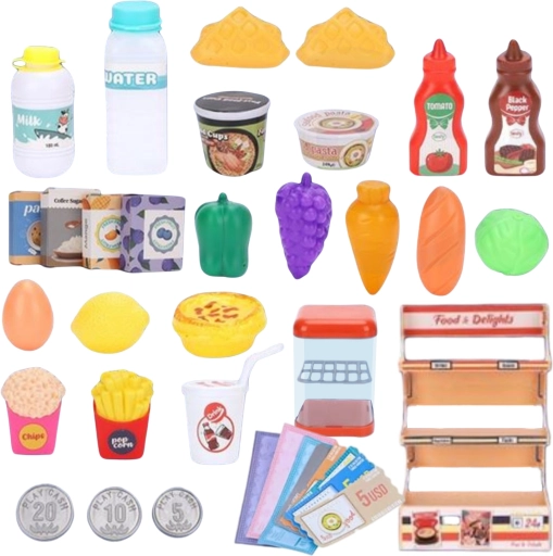 Komplet vsebuje sadje, zelenjavo, pijače, konzerve, bankovce in kovance – vse za dolge ure ustvarjalne trgovinske igre.