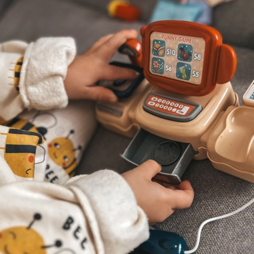 Otroci lahko »piskajo« izdelke in slišijo pristne zvoke skeniranja. Predal za denar in gumbi podpirajo realistično igro in učenje o plačevanju.