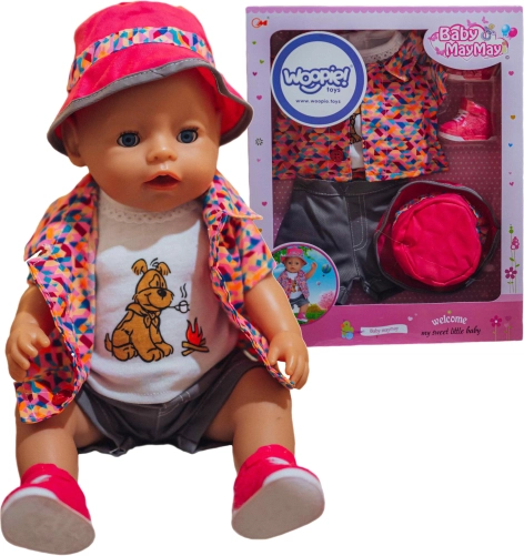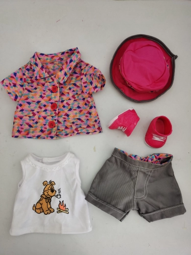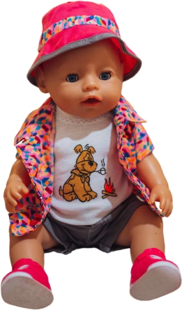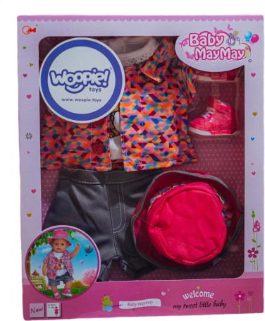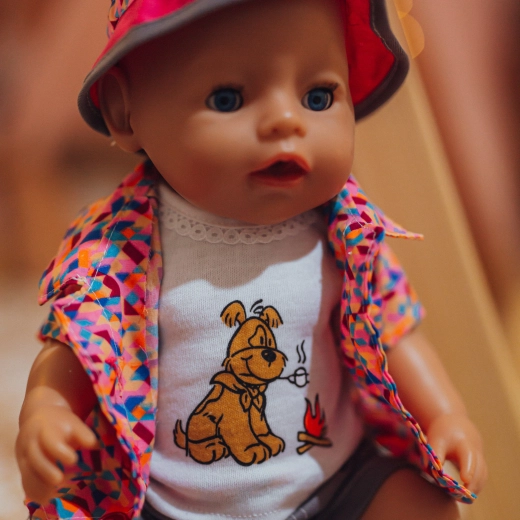 Ta pisana garnitura oblačil za punčke je odličen dodatek vsaki otroški zbirki. Vsebuje majico z ljubkim kužkom, barvito jaknico, kapico, kratke hlačke in čeveljčke – vse usklajeno v veselih barvah. Zaradi natančne izvedbe oblačila delujejo realistično in se zlahka oblačijo.