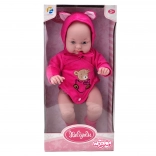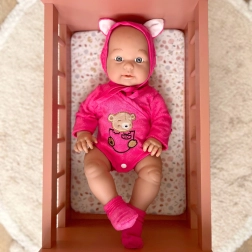 Punčka nosi ljubek rožnat kompletek z medvedjim motivom in kapuco, ki zagotavlja igriv in privlačen videz.