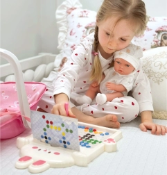 Stilno rožnato nosilo olajša prenašanje in omogoča vsestransko igro kjerkoli, s čimer spodbuja domišljijo in socializacijo.