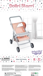 Nastavljiva strehica ščiti punčko, medtem ko jo pasovi varno držijo na mestu tudi pri živahnejši vožnji.