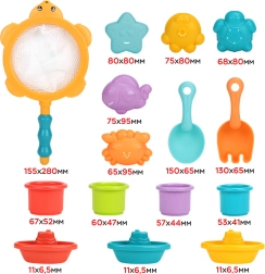 Woopie otroški komplet za vodo in pesek je idealen dodatek za kopanje in igro vašega otroka. Ta zabaven komplet je zasnovan za uporabo tako med kopanjem kot za igranje v pesku. Komplet vsebuje vse, kar vaš mali raziskovalec potrebuje: mrežico za lovljenje, 3 ladjice, 4 lončke, ki jih je mogoče zložiti enega na drugega, 5 modelčkov / pretočnih lončkov in 2 lopatki. Otroci lahko med kopanjem izvajajo različne poskuse in raziskovanja, pri čemer se ne le zabavajo, ampak tudi razvijajo svoje ročne spretnosti in spoznavajo okolni svet. Ta komplet prinaša veselje in pomaga usmeriti pozornost otrok med umivanjem.