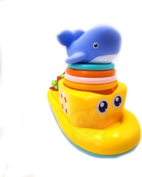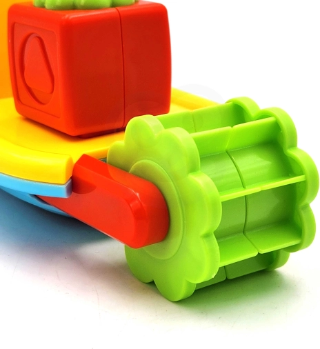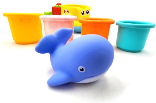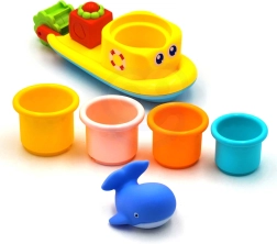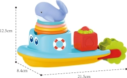 Ta pisan komplet za kopel prinaša otrokom od 12 mesecev dalje veliko interaktivne zabave. Plavajoča ladjica je opremljena z vrtljivim vodnim mlinčkom, ki se vrti pod vodnim curkom in uči otroke vzročno-posledičnih principov. Mehka gumijasta kita ob stisku piskne, s čimer spodbuja čutno zaznavanje in podpira igro v prijetnem, varnem okolju.
