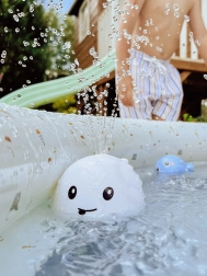 Kit plava na gladini in ustvarja nežen vodomet, ki spremeni kopel v zabavno igro ter spodbudi otroke h kopanju.