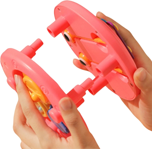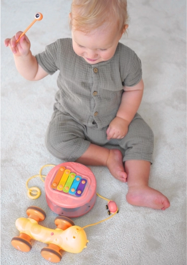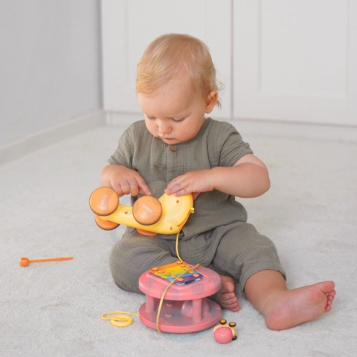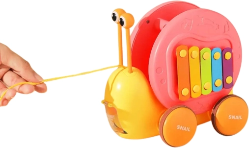 Zabavna in izobraževalna igrača za najmlajše: barvit polž na vrvici združuje vlečno igro, ksilofon z odstranljivimi “očmi” kot paličicami, zobnike/senzorične elemente in izstrelitveni avtomobilček. Spodbuja motoriko, logično razmišljanje in odnos do glasbe z različnimi načini igre.