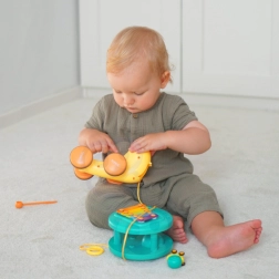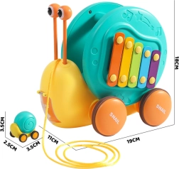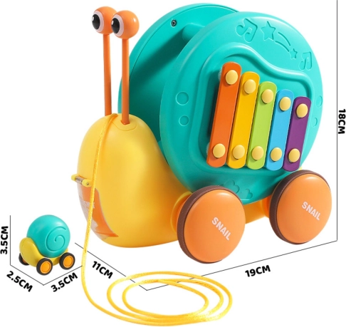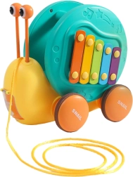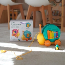 Ta večfunkcijski polž znamke WOOPIE očara otroke na prvi pogled. Barvita hišica služi kot ksilofon s tipkami, po katerih lahko trkamo s snemljivimi “očmi” – paličicami. Zaradi močne vrvice lahko otroci polža vlečejo ali potiskajo ter tako razvijajo koordinacijo oko–roka in ravnotežje. Na hrbtu je nameščen gumb, ki odpre izstrelitveno stezo za mali avtomobilček–polžka in poskrbi za veliko veselih trenutkov.