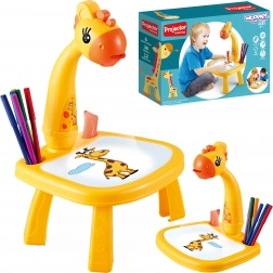 Projekcijska risalna mizica v obliki žirafe projicira barvne motive neposredno na površino mize ali na vstavljen papir. Otroci izberejo motiv, vklopijo projektor in preprosto prerišejo obrise – korak za korakom se učijo risati. Površina je suho brisljiva, zato lahko risbe obrišete s priloženo gobico in ustvarjate znova in znova.