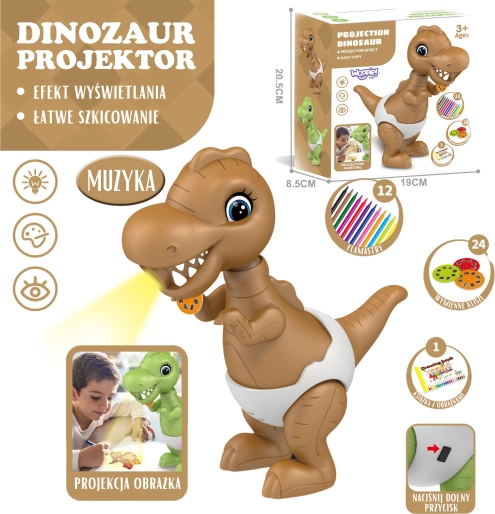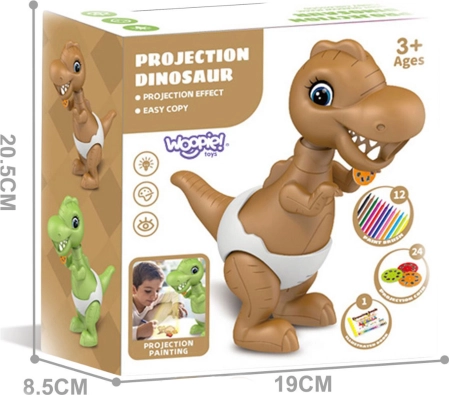 Zabaven projektor v obliki dinozavra znamke WOOPIE spremeni vsako risanje v igro. Otrok lahko s projektorjem preprosto prerisuje do 24 predlog na papir ali tabla, pri tem pa uri fino motoriko, kreativnost in umetniške veščine. V paketu je 12 flomastrov, knjižica za risanje in 3 tematski diski (pošiljani naključno).
