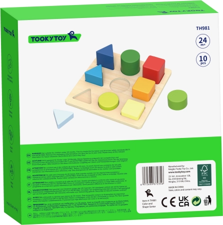 Lesena sestavljanka znamke TOOKY TOY uči otroke prepoznavati oblike in barve ter razvija fino motoriko, logično mišljenje in koordinacijo oko–roka. Otrok vstavi 9 barvnih koščkov – trikotnike, kvadrate in kroge – v prave odprtine na plošči. Odlična zabava in trening spomina ter koncentracije za najmlajše.