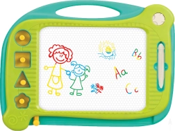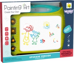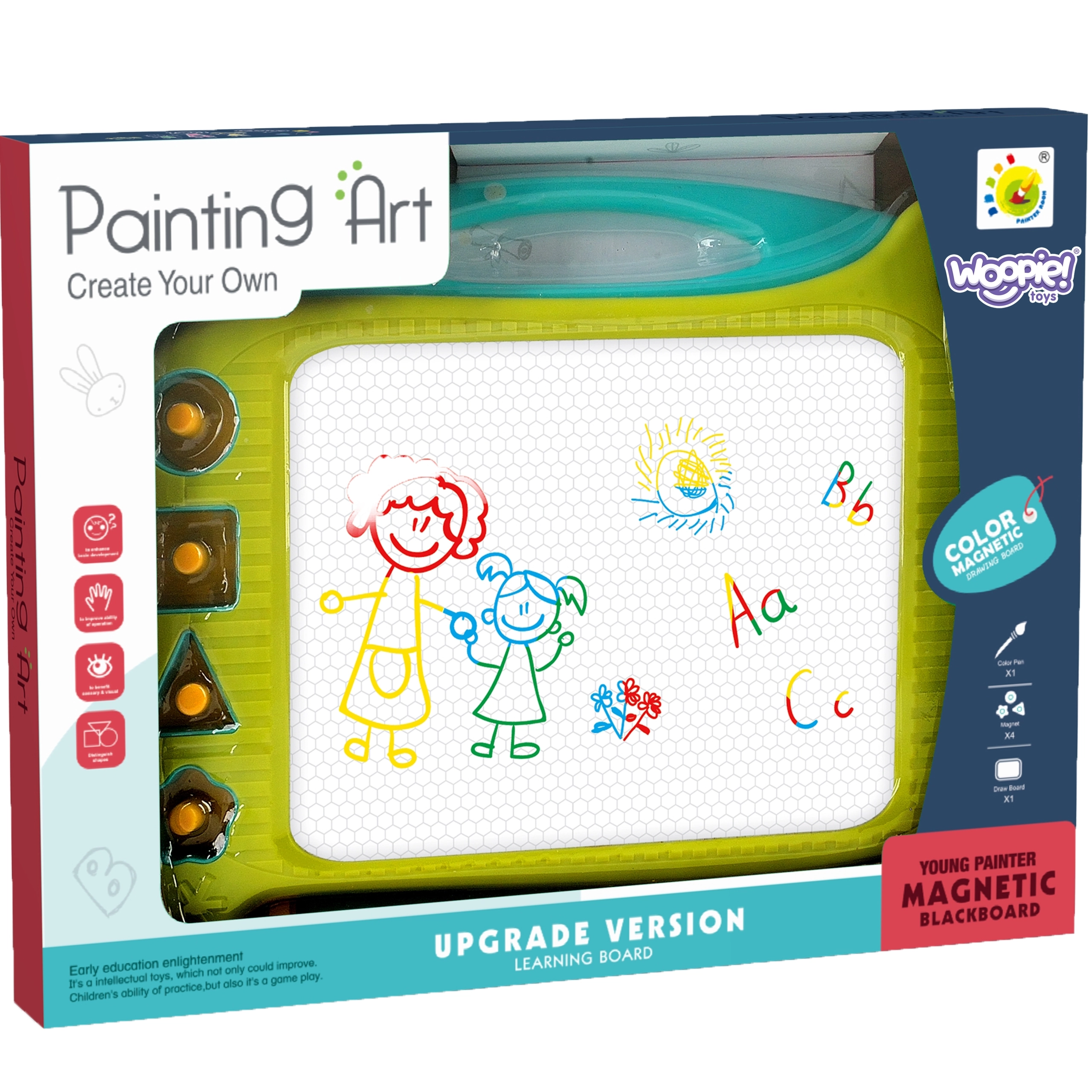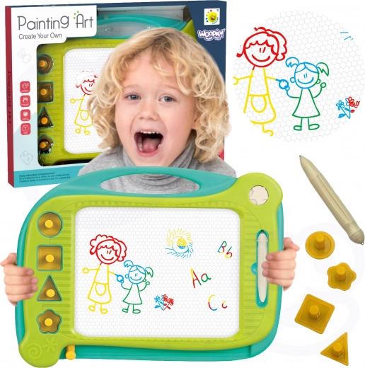 WOOPIE magnetna risalna tabla ponuja dolgotrajno ustvarjalnost in zabavo! Ta tabla spodbuja pisanje in risanje. Z risanjem se lahko vaš otrok osredotoči in umiri. Tabla omogoča ustvarjanje neomejenega števila risb – preprosto povlecite poseben drsnik in risba izgine, tako da lahko začnete znova! Set vključuje tudi čarobno pisalo in 4 žige za raznolikost. Tabla ima praktičen ročaj za enostavno prenašanje, zato jo lahko otrok vzame kamor koli. Izdelek podpira razvoj ročnih spretnosti, domišljije in ustvarjalnosti ter pomaga razvijati otrokovo umetniško plat!