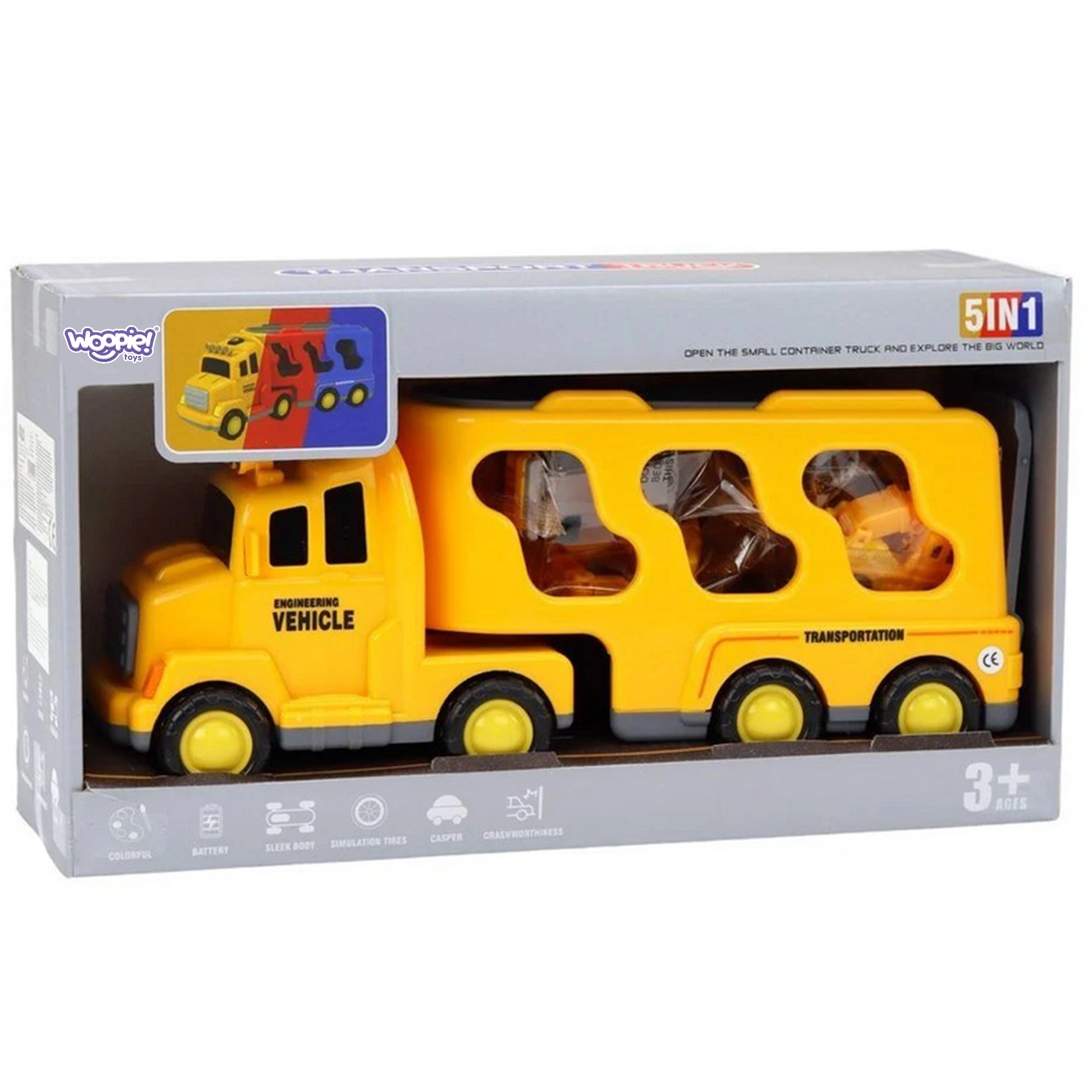 Otroški set WOOPIE z velikim vlečnim tovornjakom in štirimi gradbenimi vozili prinaša ure ustvarjalne zabave. Velik transportni vlačilec služi tudi kot shranjevalni prostor za manjša vozila. Manjši stroji imajo vztrajnik za samostojno vožnjo, celoten set pa ponuja svetlobne in zvočne učinke (3× AA, niso priložene). Primerno za otroke od 3 let za igro doma in na prostem.