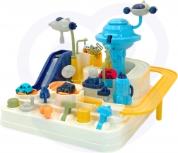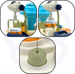 Interaktivna proga v slogu vesoljske baze spremeni vsak dan v napeto misijo. Otroci ročno sprožajo mehanizme, preklapljajo kretnice in z izstreljevalnikom pošiljajo vozila v orbito. Zaradi robustne zasnove in varnih, gladkih robov je igrača idealna za vsakodnevno igro in razvoj spretnosti.