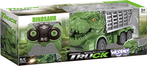 RC dino tovorno vozilo z zelenim T‑rexom in figurico WOOPIE