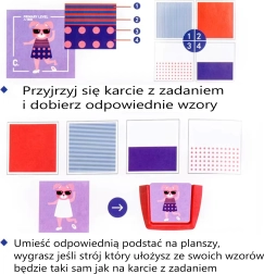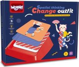 Igra Woopie Načrtuj outfit je idealna izbira za otroke od 3 let. Na stojalu otroci sestavljajo karte oblačil tako, da natančno ustrezajo zahtevanemu vzorcu in barvam na karti z nalogo. Zahvaljujoč jasnim pravilom in postopno rastoči težavnosti se otroci učijo logično razmišljati, načrtovati in se osredotočiti, pri tem pa se odlično zabavajo.