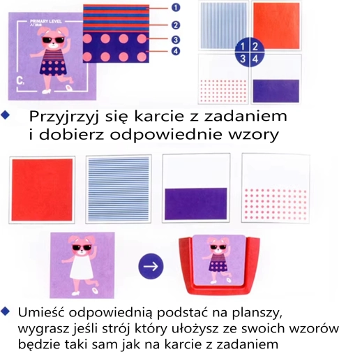 Odkrijte pametno otroško igro Woopie Načrtuj outfit, ki združuje zabavo, učenje in logične izzive. Otroci si urijo analitično razmišljanje, kreativnost in razlikovanje barv ter vzorcev pri sestavljanju pravih kombinacij oblačil po kartah z nalogami. Čaka jih 48 nalog v treh stopnjah težavnosti in štirje prisrčni junaki – mačka, povodni konj, zajec in dinozaver.